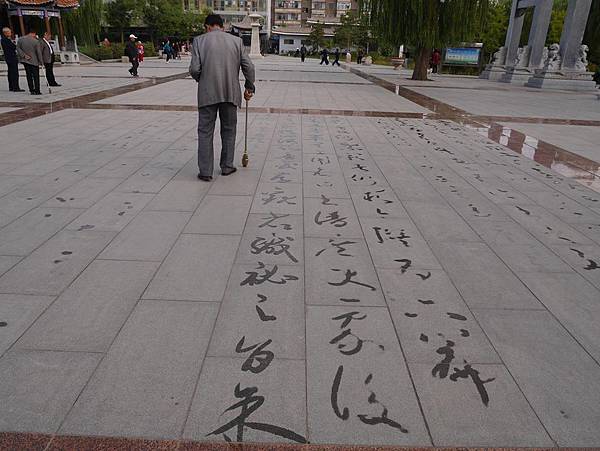 在此去可以看到老大爺熟練地拿著水寫海綿毛筆在地上練字。
