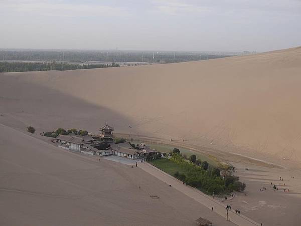 月牙泉在景區右側,觀覽的最佳角度是爬上沙山,